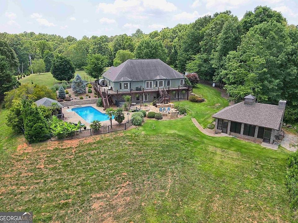 Escape to your dream turned reality with this truly incredible property boasting so many fabulous extras on 70+/- acres you'll never want to leave. Spend your days lounging by the 30K gal salt water pool with diving rock, outdoor shower and pool house, take a dip in the hot tub or outdoor sauna for a little extra relaxation, cool off in the rec room with some snacks from the kitchenette just off the pool area, or grill out with family and friends in the incredible outdoor timber frame kitchen with huge fireplace and easy breeze windows for year round use, complete with commercial gas stove, double ovens, green egg, sink and DW. Enjoy the sunsets on the stone patio by the firepit. Do you need a place to unwind from long day? Take a walk down to the 1-acre pond with dock stocked with bass, catfish and brim to take in all the beautiful nature surrounding you or take a walk along the small creek on the property. Get your day started and put your day to rest in the 3 bedrooms, 4 bath + loft office with spacious living and sleeping areas, exquisite finishes throughout including hardwood and tile flooring, vaulted and trey wood ceilings, stainless appliances and large windows providing an open and airy atmosphere. Master suite on main with soaking tub and separate shower, his and her vanity's and his and her closets as well as access to the upper deck. 2 additional spacious bedrooms with full bathrooms, a floor to ceiling brick gas fireplace in the living/dining room combo just off the well-equipped and beautifully newly renovated kitchen with a large island for food prep and extra dining space, laundry room and pantry just off the kitchen and access to the upper deck from the living area complete the main level. Upstairs you'll have a loft area perfect for a home office, play area or extra storage space. The basement boasts a workout room, full bathroom, workshop, extra storage space and a man cave/rec room with gas brick fireplace and exterior entrance and exit to the pool area. You'll have a 2-car attached garage and additional parking for guests as well as a gated entrance and acres upon acres surrounding you for privacy. 50KW diesel generator, two 80 gal hot heaters, water feature/fountain, beautiful landscaping with raised bed gardens and irrigation systems, 12 x 24 storage building, and well filter system completes this incredibly equipped home. Also, on the property you'll have a 2-bedroom, 1 full bathroom guest house complete with vaulted ceilings, screened porch, 40x70 workshop with electricity and a shooting range area. Come home to your very own paradise! Also, opportunity to invest and build other homes as the property offers many homesite options.