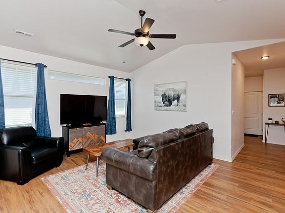 Beautiful Mediterranean style ranch home in Legends Subdivision! True lock and leave with HOA maintaining front/back landscaping and snow removal at $60.00 per month. Vaulted ceilings and natural light make the open kitchen, living, and dining a wonderful place to spend your time! Kitchen has a huge island with granite countertops, upgraded cupboards, and a nice pantry. Large primary suite with double sinks, gorgeously tiled walk-in shower, and a huge walk-in closet. Add'l bedrooms are spacious. Large laundry room! A patio out back is perfect for a BBQ and dining area and yard is mostly xeriscaped with a small area of grass. Come see today to make it your new home~