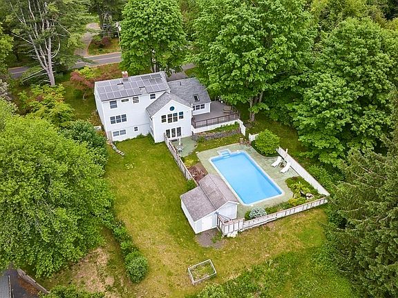 Spacious South Amherst property with contemporary open concept floor plan and expansive southwestern views of the Holyoke Range. Cherry floors, modern kitchen, and cathedral ceilings, 1st floor Primary bedroom suite with fireplace and full bath with soaking tub. 4-5 bedrooms, 3.5 baths, 1st floor laundry and guest suite on the lower level with a walk out to the patio and pool area. New composite deck off the main floor for entertaining and enjoying the views. Extremely energy efficient home with owned solar, installed in 2015, generating 0 electric bills for the owner. Extremely low heating bills, gas Buderus boiler as well as a hot air system, and central AC on the 1st floor. New septic system installed in 2013, new roof in 2015, new pool liner in 2020. This is a well cared for property in a lovely location. Great house for entertaining or retreating to from the stresses of the world, no need to go on vacation when you live here, it feels like a vacation retreat.