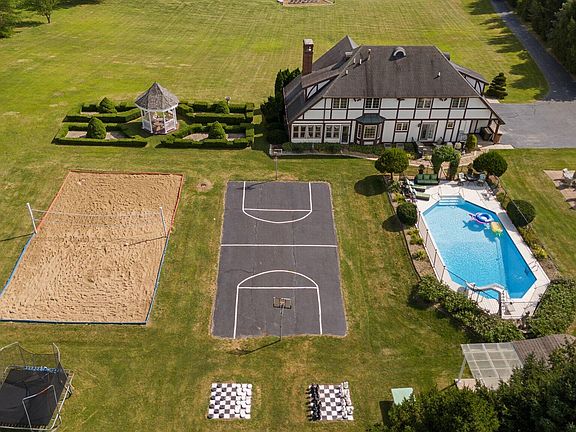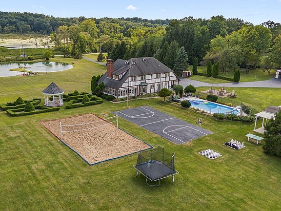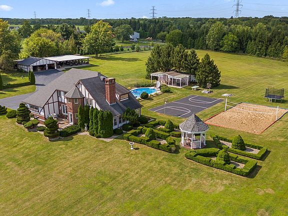 Discover your personal paradise on this stunning unique 8-acre estate! This exceptional 4,272 square-foot home is an entertainer's dream, featuring a picturesque fully stocked pond with a sandy beach area, perfect for summer fun. Enjoy active outdoor living with a volleyball court and basketball court, or take a dip in the luxurious 22' X 44' inground pool. Relax in the gazebo or under the pergola, and host unforgettable gatherings in the outdoor kitchen and pub, complete with a live music area for vibrant nights under the stars. For those who appreciate the finer things, the cigar bar adds a unique touch to your outdoor entertainment space. With multiple garages for ample storage, this property seamlessly blends elegance and functionality. Seller is even including a Home Warranty! Don't miss the opportunity to make this entertainment oasis your own! Schedule a tour today & don't miss this unbelievable opportunity!