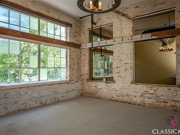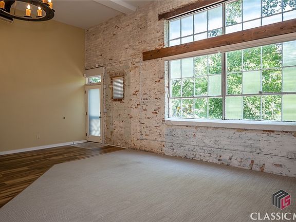 In the historically Designated Whitehall Mill, This single story loft has 2 bedrooms and 2 full baths . beautiful old brick walls with soaring ceilings and open floor plan. industrial windows . Kitchen is open to living /dining area. Some of the recent updates include California closet installation in 2020, new toilets in 2015, Newer screened door, renovated sprinkler system 2016, this building has a new roof 2020, water heater 2016, new carpet and core tech pro plus laminated flooring, gas range 2019, new master bedroom ceiling fan 2022. This unit sits above the river with the most gorgeous view!. There are public sitting areas in several places, HOA takes care of practically everything ! Water, Trash , Sewer, Road maintenance, termite bond, exterior maintenance. common area maintenance. This is an upscale contempory living along the river .A great community to be a part of.