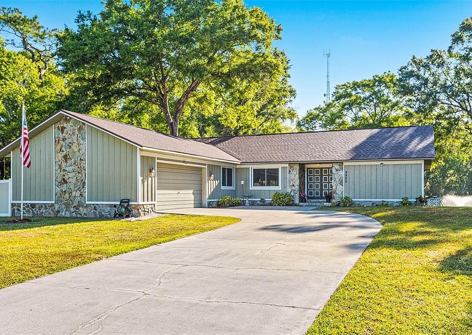 POOL HOME in The Gardens of Lake Bernadette! Situated on the most beautiful .64 of an acre this home is DIVINE! Nestled at the end of a street with pond frontage and a gorgeous fountain the home boasts 2283 square feet of living space and features galore. Enter the home through the foyer and immediately see the amazing 31 x 17 living room with wood ceilings, stone fireplace & hearth and wood accent wall with built in shelves. There are French doors that lead to the lanai here and in the master bedroom too. The dining overlooks the living room which is perfect for entertaining in this open floorplan. The kitchen was redone in 2022: new wood cabinets were installed along with epoxy counters and stainless steel undermount sink. There's also pantry cabinets plus an additional large closet pantry. There's a pot rack and even a breakfast bar! The dinette is adjacent and is the perfect spot for a breakfast table. The bedrooms are a split plan with the master on the right side of the home. The master suite boasts an 8x7 walk-in closet plus a second closet. The en suite bath has a dual sink vanity, medicine cabinet and a barn door that opens to reveal the shower, toilet and linen closet. The other two bedrooms are 12x12 and 14.5x12 with good-sized closets and ceiling fans. The hall bath has a tub/shower combo and there's a linen closet in the hall. The spacious laundry room has a sink and a coat closet. Head outside to the 48 x 12.5 covered lanai...so much shade to enjoy after a swim and the jacuzzi conveys! The screened cage area over the pool is 48 x 28 and what a wonderful oasis this is! The pool was converted to salt in 2021 so the equipment is only 2 years old. The fountain in the pond is AMAZING! During the day it's impressive but at NIGHT...WOW! There's a programmable remote and you can set the timer and choose different color lights too! The 2 car garage is oversized; it is 23 x 23 and has a work bench, peg boards for hanging items, garage door opener and attic access. The shed is 24 x 12 and offers tons of storage! There's plywood decked floor, lights, a loft area and shelves that double as a work bench. The home has a Ring doorbell in conjunction with Arlo base station and 3 remote cameras...the system is valued at over $1000 and it stays with the home. The HOA is LOW at only $50 per year and there's a playground & park area you can enjoy at your leisure. Updates: Roof 2021 | AC 2014 | Water heater 2016 | Windows 2013 | Exterior and Interior Paint 2022 | Pool Equipment 2021 | Fountain 2021| Room Feature: Linen Closet In Bath (Primary Bedroom).