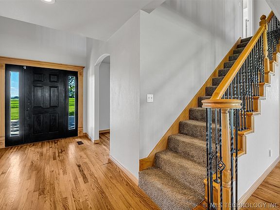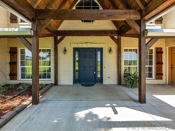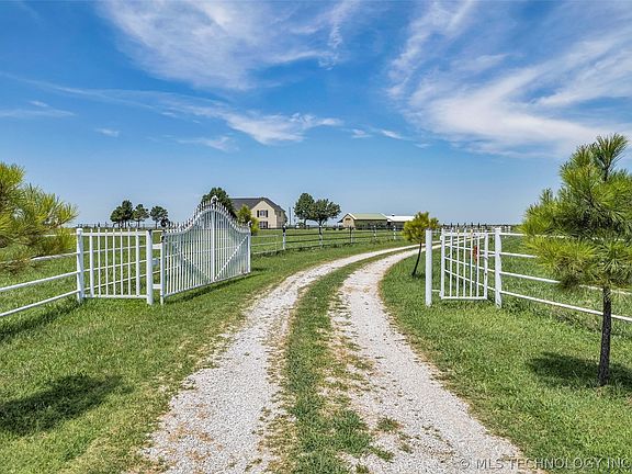 Welcome to 5850 S 4080 Rd, Talala - a stunning estate on 20 picturesque acres. This exceptional property features a spacious main house with 4 bedrooms, 3 full bathrooms, and a half bathroom. Inside, you'll find the elegant living room with library paneling, and the formal dining room that is perfect for hosting. The large kitchen includes granite countertops, a center island with prep sink, ceramic cooktop, and KitchenAid appliances. The lower-level guest bedroom has a full bath with a Jacuzzi tub, while the master suite offers a luxurious bath with two sinks, a jacuzzi tub, marble shower, and additional washer/dryer connection in the walk-in closet. The expansive game room is complete with a wet bar, beverage fridge, and half bath. Additional spaces include an office, hobby room and mudroom with utility sink and half bath. Outside you'll find a 3-car garage, a shop building approximately 30 x 40 with a 20 ft overhang, electricity, and a bathroom with a shower. For equestrian enthusiasts, there's an 8-stall horse barn and a small pond adding to the scenic beauty. Other outdoor spaces include a covered porch and patio. Modern amenities feature 2 HVAC systems (one brand new), propane heat, 2 hot water tanks, newer carpet, hardwood floors, floored attic storage. Minutes to Oologah Lake and schools and an easy drive to Owasso shopping.