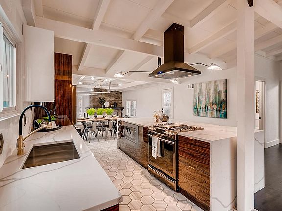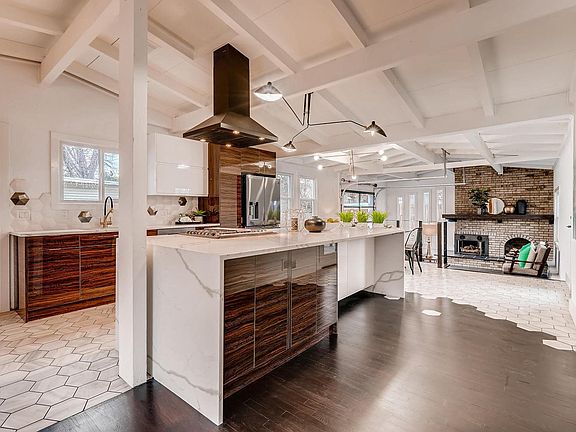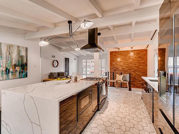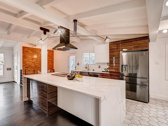 This one of a kind, Mid-Century masterpiece has been updated with high-end and custom features throughout. Every room was finished with complete attention to detail. The vaulted ceilings, exposed throughout the main floor, create a feeling of grandeur in this entertainer's dream home. The kitchen will blow you away with frameless Euro-style cabinets and gold finger pulls, high end black stainless appliances, three-dimensional hexagon tiles imported from Spain, and beautiful quartz waterfall counters! The West Elm light fixtures add the finishing touch to this masterpiece. Your sunken living room, with its oversized brick fireplace, becomes one with the outdoors when the 8' wide glass sectional door is opened to the south facing patio and built in brick grill. The north facing deck provides the shade for hot summer afternoons. Located a short walk from the heart of Old Town Arvada and the soon to open train stop, and a block from the Ralston Creek Trail, the location can't be beat!