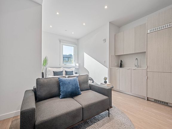 Designer Kitchenette: Hardwood cabinetry, quartz countertops, and European-style refrigerator.