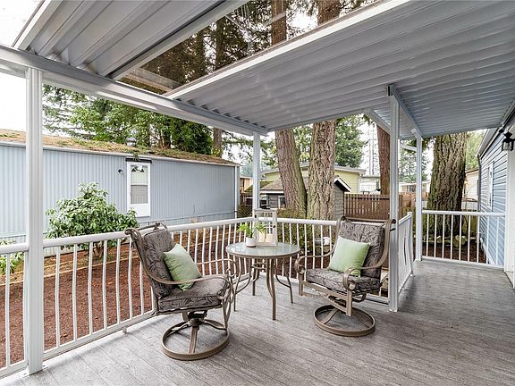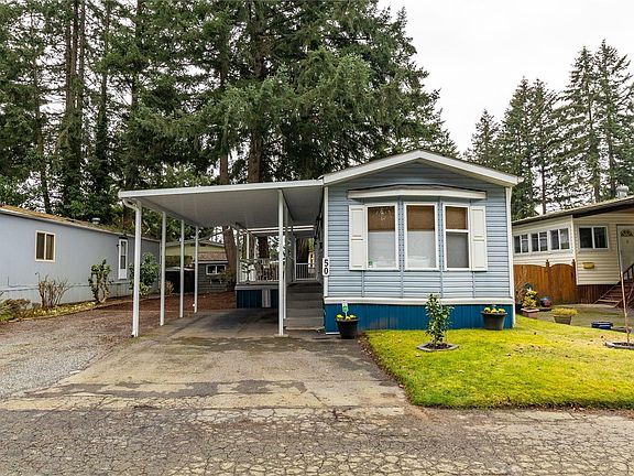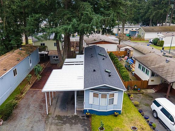 Located in North Nanaimo's sought-after Woodgrove Estates 55+ small pet friendly community; this modular home offers style & convenience within walking distance to shopping, dining, & recreation. A comfortable layout to call home with vaulted ceilings, an open floor plan, & bedrooms with full baths on either end. Some of the numerous updates include stunning custom maple cabinets, granite countertops, tiled backsplash, new vinyl flooring, carpeted bedrooms, Poly B plumbing replaced with new PEX, a ductless heat pump, new light fixtures throughout, custom window coverings & a walk-in tub for accessibility. Bathrooms boast new sinks, faucets, counters, & toilets. Exterior upgrades include a new roof, skylights, gutter guards, aluminum skirting around the home, new aluminum patio cover & new vinyl decking for year-round enjoyment. The low-maintenance yard has mature shrubs, 2 sheds, & parking for 3 vehicles, plus free RV parking in the park. Immaculately kept & move-in ready!
