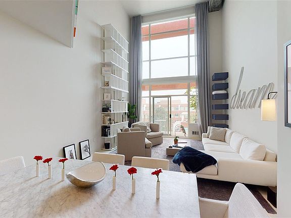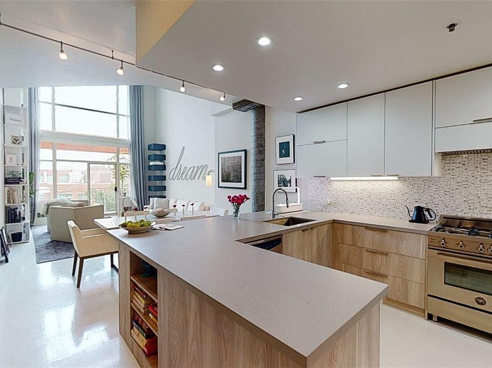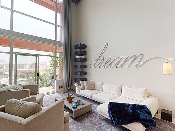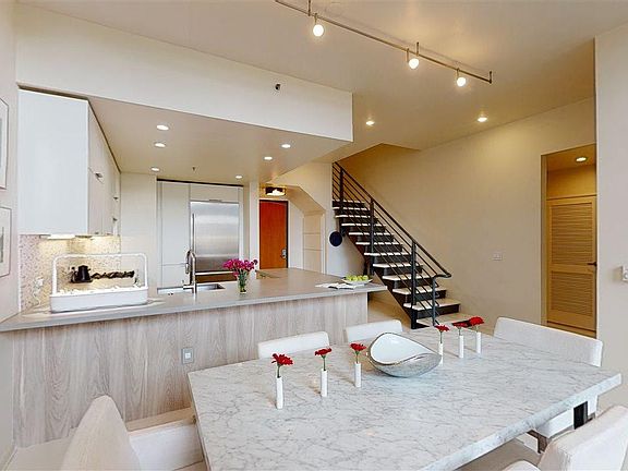 Spacious, stylish condo, conveniently located near shops, cafes, and freeway access. Dramatic two story LR w/floor-to-ceiling windows & sliding glass doors to balcony. DR area adjoins the fab remodeled kitchen w/European style cabinets and upscale appliances. Exposed concrete columns and beams. Very sophisticated, minimalist aesthetics, high ceilings, open floor plan, bathed in natural light. Romantic master suite w/custom closet system. Cozy upper level loft is ideal for home office or TV room. LR white Roche Bobois double story shelves and built-in boxes included.