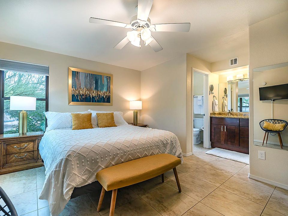 Stunning Catalina Mountain and Ventana Golf Course Views! Gorgeous Renovated 3 Bedroom, 2 Full Bathroom Condo. Pristine Clean! Perfect for your vacation rental stay or longer mid-term stay. Golf. Hike. Bike. Swim. Fitness. Experience the beauty of the Catalina Mountains and Ventana Golf Course from this meticulously remodeled 3-bedroom, 2-bathroom condo. Nestled in an ideal location, this inviting condominium offers a complete kitchen, elegant tile flooring throughout, and a charming private balcony where you can relish in the mesmerizing Arizona sunset. The thoughtfully designed split floor plan situates the main living area at the heart of the condo, ensuring comfort and privacy. The master bedroom and second bedroom boast luxurious king-sized beds, while the third bedroom features two cozy single beds. Every detail in this condo exudes sophistication, with a fully equipped kitchen featuring top-notch cookware and stylish table sets. The living room provides a dual pleasure - admire the Catalina Mountains through its windows or step onto the private patio to bask in their majesty. Within this community, you'll discover an array of amenities to enhance your stay. Take advantage of three heated pools, two relaxing jacuzzis, a modern exercise room, and convenient grills available at each pool area. Situated in the foothills, this condo enjoys an enviable location within walking distance of a grocery store, numerous restaurants, a rejuvenating day spa, Sabino Canyon, and Ventana hiking trails. Additionally, it's only minutes away from the renowned Ventana Canyon Resort and Golf Club. Rates: nightly, weekly, & monthly dynamic pricing based on market evaluations. We are committed to protecting our properties and keeping up-to-date with short-term rental regulations, which is why you will be asked to complete our independent verification. Please note: Before your booking begins, you will need to verify your details with us to complete your booking. You will be contacted via email to complete the verification. Month to Month, Short term Vacation rental lease or Mid-term leasing available