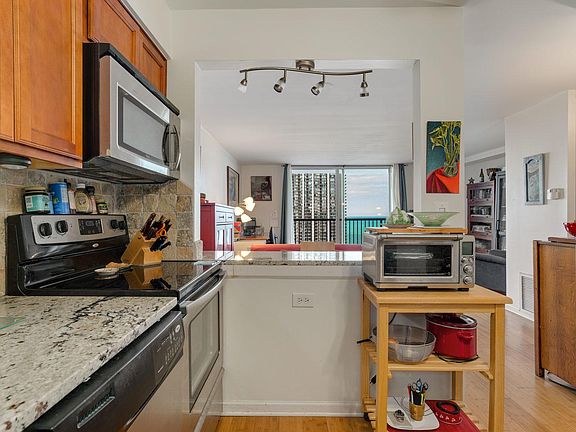 Stellar views from 30 ft. balcony, north facing, beachfront 1000 sq. ft. condo in a full amenity building. Updated with bamboo wood floors, granite kitchen counter tops, cabinets, stainless appliances and passthrough. Huge balcony runs the length of the unit and has great views all the way to the Bahai Temple in Wilmette with doors from living room and bedroom. Newer balcony sliding glass doors. Indoor heated parking and storage included. Resort style living in Chicago! Building has exercise room, outdoor pool, party room, 2 outdoor decks overlooking the lakefront beach. 24hr doorperson, laundry room, internet and cable TV included in assessments. Well run association with good reserves. Pet friendly, dogs & cats OK, no weight limit, 2 per unit. 100% Owner Occupied, no rentals. Close to restaurants, Red Line EL stop, shopping, two bus stops, Loyola (6 blocks away), beach access on both ends of the street, Lake Shore Drive bike path, playground, and dog park.