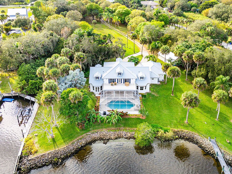 Welcome to Imagination Plantation, a 5-bedroom, 4-bath waterfront estate on 4+ acres in Palm City -- including a 3+ acre vacant buildable lot fronting the main residence. Built in 2006 and thoughtfully updated with a 2022 roof, full impact glass, and fresh exterior paint, the home offers nearly 4,000 sqft of open living space, plus an elevator. The interior flows seamlessly to a screened-in pool and covered patio, while a circular drive and 3-car garage enhance convenience. Along the water, you'll find a 60-ft dock with over 200 feet of wide waterfrontage and direct ocean access a dream for boating families. This rare property is minutes from I-95, the Turnpike, and vibrant local amenities in both Palm City and Stuart. Located within an A-rated Martin County school district and free of HOA restrictions, this estate offers flexibility, space, and a once-in-a-lifetime setting to build your vision.