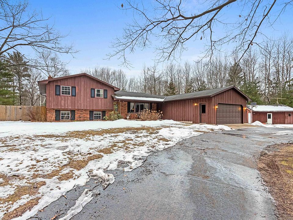 There's room to roam in this spacious 5 bedroom, 3 bath home tucked away on 1.5 very private wooded acres in Little Suamico. This home features 2396 square feet. Open floor plan on the main level offers a kitchen with pantry, raised panel cabinets, 2 skylights and patio doors off of the dinette that leads to the awesome backyard. The spacious primary suite was an addition to the original structure and offers patio doors to the backyard, walk-in closet, and full bath with double sink vanity. The second living area has a wood-burning fireplace, new high efficiency furnace and central air in 2023. 22x20 outbuilding/workshop. New dishwasher in 2023. 1st floor laundry. Please allow 72hrs for binding acceptance.
