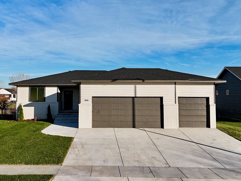 Back by popular demand, this Baby Bella Plan by RJ Castle Custom Homes offers an exceptional opportunity to live on a gorgeous lakefront lot in one of Wichita's premier neighborhoods—Watermarke. This stunning 4-bedroom, 3-bathroom home is designed for both comfort and style, featuring a spacious master suite with a private bath, full tile shower, and an expansive walk-in closet. The heart of the home is the open, light-filled living area, with a rear-facing kitchen complete with sleek quartz countertops, a walk-in pantry, and a seamless flow into the living room for easy entertaining. Step outside to enjoy a large covered deck that leads to a spacious ground-level patio, perfect for outdoor gatherings and enjoying the serene lake views. The fully finished lower level offers even more space to spread out, with a generous family room, a walk-up wet bar, 2 additional bedrooms, and a full bath. For added convenience, the 3-car garage includes an extra rear-facing garage door, offering easy access to the backyard with a concrete slab for parking or additional storage. Don't miss your chance to own this beautiful home in the coveted Watermarke community—where luxury living meets lakeside tranquility! Finished interior pictures are of a finished version of this plan previously built in Watermarke (Exact finishes will vary). Some information may be estimated and is not guaranteed. Please verify schools with USD 262.