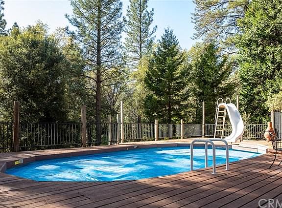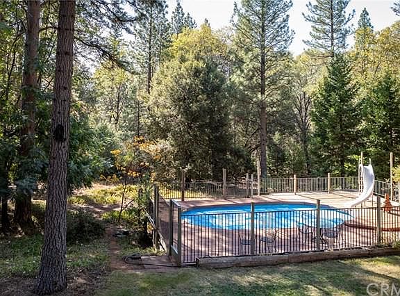 Custom 4-bedroom home nestled on 7+ acres of serenity! Nicely landscaped, irrigated homesite area with a fenced pool/deck/slide is nestled in the pines and surrounded by nature. Private gated entry, oversized 2-car garage, storage, room for your RV or "toys", fenced/cross fenced area and dog kennel. Inside you will appreciate the skylights, ample natural light, and a passive solar design optimized to utilize the suns rays for winter heating and strategically located windows for evening cooling in the summer. As an added bonus, there is a newer HVAC system to further ensure your comfort year-round! Tucked away private office is just off the comfortable library/den with a vaulted ceiling, walls of tall bookshelves and, a rolling ladder to reach those upper shelves! The living room is just off the den, through a set of French doors, and features a unique free-standing wood stove with a decorative stone hearth and corner surround. 3 bedrooms with unique loft areas and one bath with a unique sunken tub/shower are one level. And just up a custom iron circular stairway is the master suite, complete with a deck overlooking the yard and pool area.