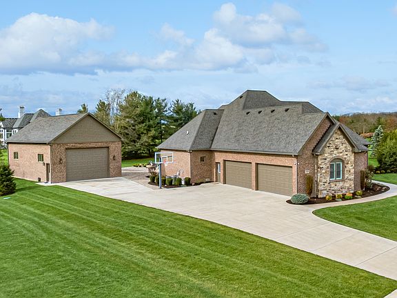 This absolutely breathtaking custom home was designed and built by Duke Homes, Johnson County's Premier Custom Builder. Located in the highly respected CLAYBOURNE neighborhood in White River Township, this full brick exterior one level home with finished basement offers over 5300 square feet of living space, HUGE four car attached garage, in-ground swimming pool plus a detached 1232 square foot multiple use building with Brick Exterior, custom lighting package, finished interior, over-sized overhead garage door, separate electric panel, and bathroom. Currently set up as a half court basketball court complete with basketball goal. Looking for Privacy? Home sits on a beautifully landscaped 1-acre lot with a tree lined boundary that affords the privacy everyone desires & seldom finds. The in-ground pool area sparkles with its covered patio, professional landscape areas, expanded concrete decking which will accommodate extra lounge chairs and large gatherings of friends & family. Gunite Pool includes auto cover, fountains & can be heated when changing seasons necessitate. The interior of the home is picture perfect. Large entry opens the main level living space showcasing stunning hardwood floors. The Great Room offers a vaulted ceiling, B/I bookcases and Gas Fireplace. Kitchen space has large Center Island w/seating for four, custom cabinets, granite countertops, and full S/S appliance package. Adjacent Dining area will accommodate the largest of dining room furniture and quick access to the outdoor areas. Split Bedroom format offers two large secondary bedrooms with a Jack & Jill Bath area plus the large 18'x16' Primary Suite with tray ceiling, large W/I closet & Bath Area with tiled Luxury Shower, dual sinks w/granite counters. Basement is an Entertainment Mecca. Enjoy the 28'x18' Family Rm or the 22'x15' Rec/Play area. Entertaining? Food Prep Center/Bar area with huge Center Island w/seating for four is perfect, Need extra space? Two more Bedrooms & a Full Bath.