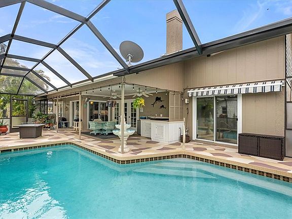 Life is spectacular at Gulf View Estates, where residents enjoy being less than three miles from Manasota Key Beach and the public boat ramp. This thoughtfully updated pool home offers two bedrooms and two bathrooms and is located in the X flood zone, providing added peace of mind. Mature landscaping and a welcoming walkway lead to the screened entry, where double glass doors open into a light and inviting interior. Vaulted ceilings, a skylight, and a chandelier immediately create a warm sense of arrival. The open floor plan connects the great room, formal dining area, and kitchen, making the home ideal for both everyday living and entertaining. A brick fireplace adds character to the great room, while a triple set of French doors fills the space with natural light and opens to the outdoor living area. The galley-style kitchen is both functional and inviting, featuring wood cabinetry, granite countertops, a glass tile backsplash, and a tray ceiling with crown molding. A cozy breakfast nook includes two sets of sliding doors, offering easy access to the pool and lanai. The formal dining area is accented by a bay window and chandelier, creating an elegant setting for meals and special gatherings. The ensuite primary bedroom features vaulted ceilings and French doors that bring in abundant natural light. A walk-in closet provides generous storage, and the ensuite bathroom is designed for comfort with a spacious walk-in shower that includes dual skylights, multiple showerheads, built-in niches, and a convenient fold-down seat. On the opposite side of the home, the guest suite offers privacy and includes sliding doors that open directly to the pool area. The nearby guest bathroom features a uniquely designed fully tiled shower with sliding doors that also provide access to the lanai. Built-in cabinetry and a laundry sink in the separate laundry room add valuable storage and functionality. Outdoor living is truly exceptional. The partially covered and screened lanai features custom concrete flooring, ceiling fans, and an outdoor kitchen complete with a wet bar and Jenn-Air grill. An outdoor shower, a thoughtfully designed corner heated pool, privacy screening along the lower portion of the cage, an open area with a roll-out awning, and mature landscaping surrounding the enclosure create a private and relaxing retreat. Additional highlights include a 2021 roof, a 2020 air conditioning system, and an upgraded electrical panel. Located in the well-established Gulf View Estates community, this home offers close proximity to Venice, where beaches, boating, fishing, dining, and year-round events define the Florida lifestyle. With no CDD fees and a low annual HOA fee to keep the community beautiful, this pet friendly residence offers both comfort and convenience. Everything comes together beautifully at 5859 Monroe Road, a place designed for relaxed living, easy entertaining, and enjoying the very best of coastal Florida.