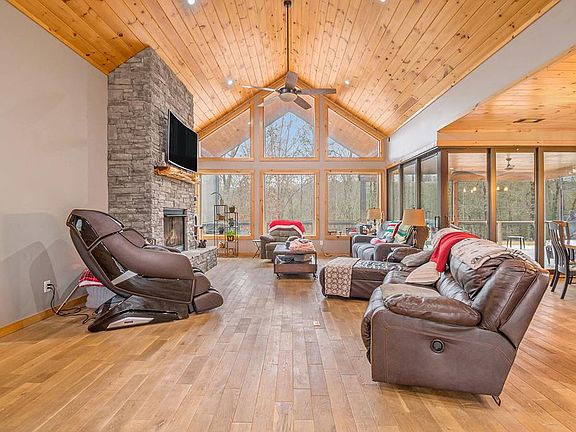 NOW OFFERED BELOW APPRAISED VALUE! Don't pass up this UNRESTRICTED 20+ creek front acreage w/custom built home! The moment you walk through the decorative double MAHOGANY doors, you'll appreciate the expansive great room w/OAK flooring, Lg. Stacked Stone FP, and vaulted KNOTTY PINE ceiling. To help make the main level even roomier, multiple windows with “L” shaped retractable glass panels lead out to a huge screened porch w/wood burning FP. This wonderfully designed home boasts a spacious kitchen w/vented gas cooktop, stainless appliances, farmer's sink, granite counters and walk-in pantry. Primary BR offers large windows w/electric shades and/or blackout coverings. A roomy walk-in closet and beautiful en suite. 2nd BR consists of custom built shelving, window seat and a nice en suite. 3rd room can be used as an office/guest room. The opposite side of the home offers entry to the extra deep 2 car garage, a powder room, huge mud room w/elevated W/D, shower for pets and a bonus room w/sink. Terrace level includes a BEAUTIFUL custom bar, gas FP, large media room w/mood lighting, adobe surround sound & 85” TV. Rounding out this exquisite home are 2 additional bedrooms, a full bathroom, laundry room and 2 more rooms that can be used for exercise, storage and more! Property can be enjoyed as your private oasis, a mini farm or possibly be divided for resale. Close proximity to hospital, Downtown Blue Ridge, Merciers Apple Orchard and Tennessee. Adjacent 20 acres also available for purchase.
