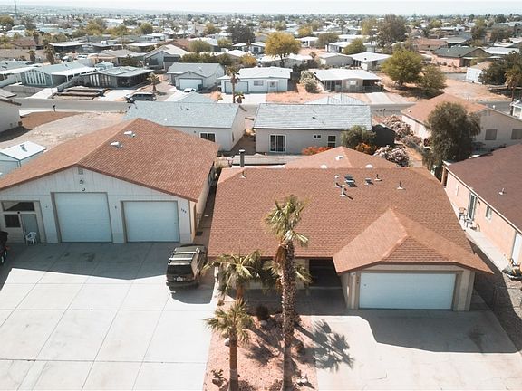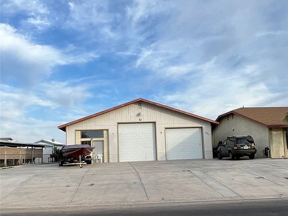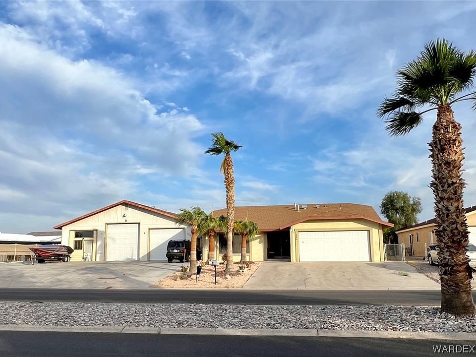 COME LIVE BY THE RIVER! Holiday Shores Gem. Great to Live in or be a Vacation Home by the RIVER. This Home Sits on 2 Lots for a Total of 11,326 Sq. Ft.. That is a Whopping .26 of an Acre to Park all your RV, Boats and Toys and your Friends Stuff Too. Let me Tell you About the Total Garage Space of 2,289 sq.ft. with 3 Garage Doors, Two are 10' and one is 12' feet high. This Garage is a Hard to Find Amenity with Room for a Workshop, Man Cave and to Park Almost Anything. It is Fully Insulated and has a Permitted Bathroom with all Plumbing and Drains Already Installed but Needs to be Completed. You Could Add a Few Walls and Have Another Living Quarters for Guests or Rent it Out. . It has RV Hook-ups and a Dump. You Can Park a Dozen Cars on the Concrete Driveway. The Stick Built Home has 3 Bedrooms and 2 Baths, a Formal Living Room and a Kitchen that is Open to a Family room with a Fireplace. There is an Additional Attached 2 Car Garage. The Backyard Has Nice Shaded Patio Area with a Water Feature Pond and Landscaped with Beautiful Plants and Trees. Great BBQ Area. Only a Mile to the River and Boat Launch at Rotary Park. Close to Shopping, Medical Services, Lake Havasu and the Casino's in Laughlin NV. Come View this Property today and Enjoy the River and Desert Lifestyle. LIFE IS BETTER AT THE RIVER.