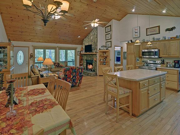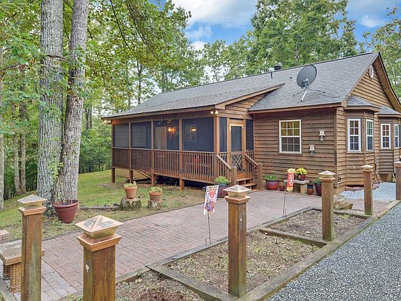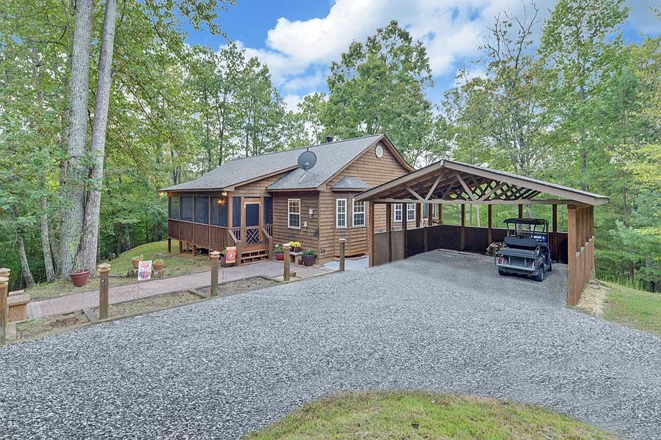 This warm, single-level ranch retreat feels complete from the moment you arrive. Set on two lots totaling 2.22 acres within a gated community, this 3-bed, 2-bath home blends rustic charm with modern comfort. Cathedral and tongue-in-groove ceilings draw your eye upward while the great room's stone, wood-burning fireplace invites the kind of cozy gathering every home should have. The heart of the house is the beautifully appointed kitchen: solid wood floors, matching cabinetry, a center island with breakfast bar, plus space for more formal dining when needed. Main-level living gets easier with a walk-in laundry and multiple access points to a wraparound screened porch where friends and evenings linger effortlessly. With fiber-optic internet there already, plus a detached double carport, you get both connectivity and practicality. More than space, more than style, this is where your everyday feels like a retreat.