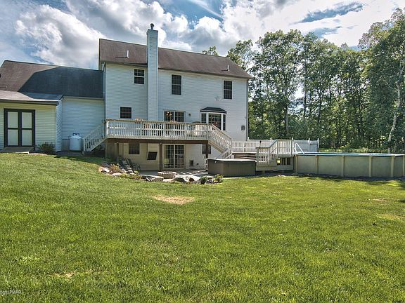 This Colonial Home has it ALL! 5 Bedrooms 3 1/2 baths. Finished walk out basement, 3 tier deck with swimming pool, 2 car garage with 12 X 14 Shed connected, and fenced in yard. Upon entry you have open foyer area, to the right a formal dinning room, on the left formal living room, continue straight passed half bath and enter eat in kitchen and family room area. From eat in kitchen you can go out the the deck through the sliding glass door to deck and pool. Up stairs you have 3 roomy bedrooms, main bath and large master suite with glass shower, separate tub, and Huge master closet. Basement finished area includes large family area with built in bar and cast iron wood burning stove to heat in winter months, A bedroom and full bath. All On 1.45 acre, No development and No dues. Taxes $7535