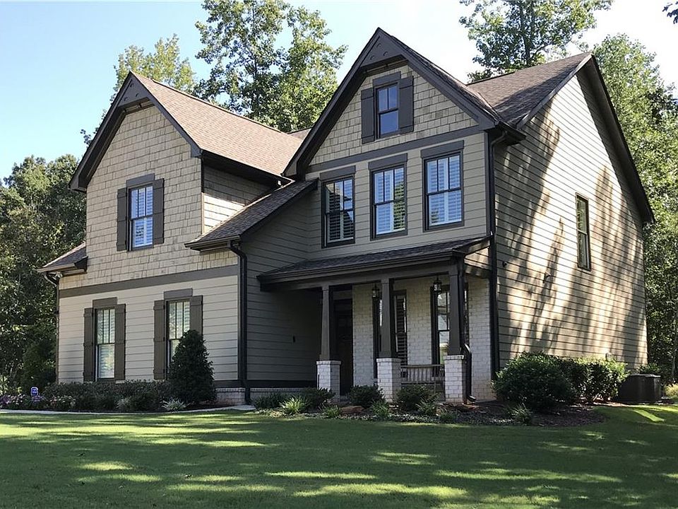 A RARE FIND in Forsyth County—this welcoming 4-bedroom 3.5 bath residence is beautifully situated on 2 private park-like acres. Experience a tranquil stroll on your personal walking path through tall hardwoods along a gently flowing creek. Step in from the covered porch where the view from the foyer reveals an open floor plan featuring a soaring great room with floor-to-ceiling stacked stone fireplace. Overlooking both the great room and living room is the eat-in kitchen equipped with a large granite center island with breakfast bar, plenty of counter and cabinet space, and ample walk-in pantry. The stainless appliances, including a 36” gas cooktop and hood, have been enhanced with a newer Kitchen Aid convection wall oven. Tall wainscoting and upgraded lighting adorn a separate dining room. The impressive primary bedroom suite encompasses a spacious walk-in closet and deluxe primary bath with a soaking tub and raised-height granite vanity with double sinks. The 3 secondary bedrooms have ensuite baths and generous closet space. The laundry room is conveniently located upstairs. Upscale Schrock cabinets in Kitchen and full baths have a soft-close feature and dovetail joinery. Fully opening plantation shutters dress every window. A 3-car garage and a Craftsman-style 16x10 outbuilding provide abundant storage space. This 5-year-old residence is in the Wild Rose Subdivision where you’ll enjoy nicely spaced homes, mature landscaping, gently rolling terrain, and a community clubhouse and pool. Only 5 miles to GA 400 and 2 miles to Country Land Golf Course. Just a short drive to Charleston Park, Keith Bridge Park, and Thompson Creek Park on lake Lanier, providing hiking and bike trails, picnic areas and boat launches.