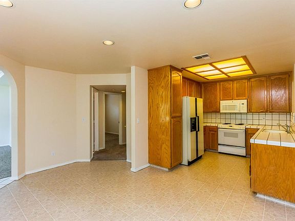 Lovely home in a wonderful neighborhood. Very spacious desirable floor plan with a living room and a family room between the kitchen and eating area. Spacious master bedroom with vaulted ceilings and 2 separate closets plus your own private sliding door to the patio. Large master bathroom with vanity counters along with double sinks plus a tiled shower. Hall bath features dual sinks, and tub with tiled shower enclosure. Enjoy your summer evenings on the covered patio that has a serve thru counter from the kitchen. Landscaped yards, front and back.