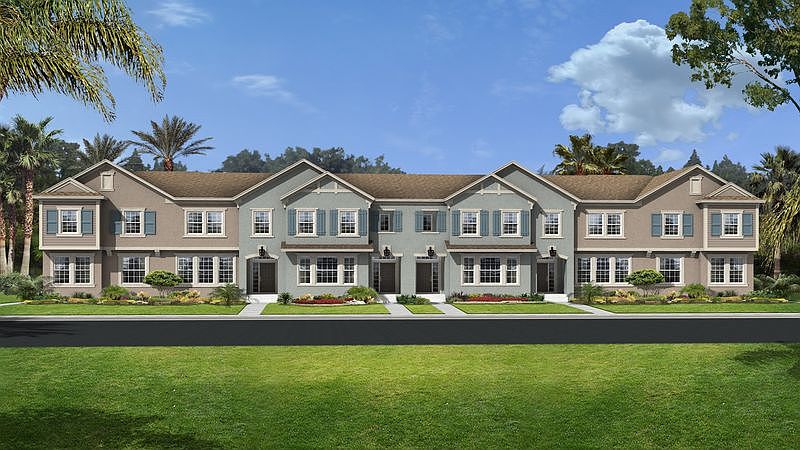 The Auburndale Plan is a two-story townhome with two bedrooms, two and a half baths, and a two-car garage. This home offers an open floor plan with kitchen, living room, and dining room. The first floor of this home is completed with a powder room. The second floor includes the owners suite with large walk-in closet and outdoor access to a balcony, owners bath with separated shower and tub, and a loft.