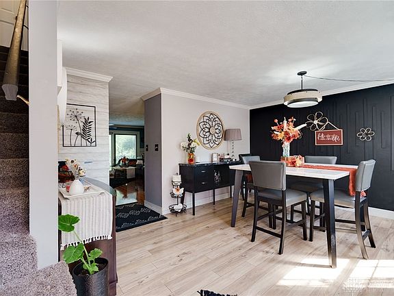 Stunning townhouse in popular development located in convenient location. Prepare to be impressed as you walk through this beauty. Welcoming Living/Dining Room...striking accent wall with wood trim. Room is complimented with LVP wood flooring and crown molding. Kitchen and Family Room are open and space is flexible depending on your needs. Family Room features crown molding, white washed wainscoting reclaimed wood and WBFP which is offset by whitewashed bricks and wood mantle. Chefs Kitchen is both elegant and functional with striking SS Appliances. White cabinetry is accented with black hardware and tile backsplash. Enjoy hanging with the cook or just eating at the breakfast bar. Deck which was just replaced by HOA, has beautiful view of tree line. Owners Suite includes walk-in closet plus neutral half bath. Second bedroom is huge and offers two closets. Main Bathroom has received gorgeous updates. Lower Level includes huge Laundry Room with lots of storage. Attached built-in garage is one car with almost another bay for for storage/gym/man cave. HVAC 2023. HOA fee includes landscaping, snow removal, exterior maintenance, pool and fire pit.