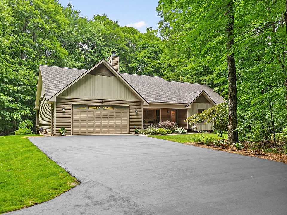 Welcome to this a stunning custom-built home situated on over 5 beautifully landscaped acres, offering a perfect blend of serenity and convenience. This one-owner ranch-style residence boasts 4 bedrooms and 3 baths, providing ample space for comfortable living. Step inside, and you'll be welcomed by the warm ambiance of a fireplace in the living area, creating a cozy atmosphere during chilly evenings. The main level features 1,800+ square feet of living space, including 3 bedrooms and 2 baths, offering both space and privacy. The lower level is equally impressive, encompassing 1,700+ finished square feet, featuring a nonconforming bedroom, a luxurious sauna to relax and unwind, a billiard room for entertainment, ample storage space, and a functional workroom for various projects. Outside, revel in the picturesque views and appreciate the beautifully matured landscaping that surrounds the property. The home comes complete with a screened-in porch, ideal for enjoying the outdoors in comfort. This deep lot with a sprinkler system, ensure a lush and vibrant environment year-round. Additional bonus features include a storage shed, a fun treehouse, invisible pet fencing, and an outdoor hot tub spa to soak in for the ultimate relaxation experience. This home also includes an oversized 2-car garage, providing ample space for vehicles and storage. The entire property has been meticulously maintained and furthermore updated and improved over the years. Recent enhancements such as a new gas water heater, newly re-done wood floors, a replaced well head, a new garage door, a new roof, added roof insulation, new siding, a new sliding door, a newly sealed driveway, and freshly cleaned carpets. All contributing to a home cared for. With all of these upgrades, you can move in with peace of mind. Live the life you've been waiting for in this perfect fit home. Enjoy the serenity and privacy that you desire.