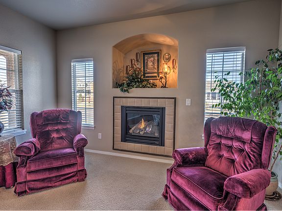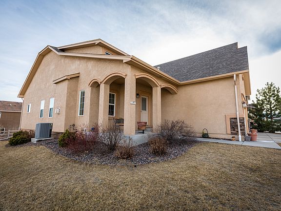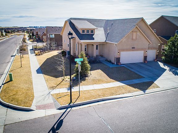 Gorgeous well maintained home in desirable Wolf Ranch* This Ranch style home is nestled among a corner lot with perfect Pikes Peak views from your driveway* Full stucco and stone exterior provides easy maintenance for years to come* The community provides many amenities such as a dog park, water fountain, community center, rec center, and pool* Heading inside this Creekstone home you are greeted with wood floors that flow throughout the high traffic ways and into the kitchen* Formal living room off the entry has a cozy gas fireplace and is open to the formal Dining room which has decorative archways* The Dining room walks into the Eat in Kitchen which has plenty of cabinets and countertop space* Kitchen also has a small tech desk, dining nook and walk out to the well landscaped backyard* Master bedroom is located on the main level with french doors leading you inside* The Master feels open with the vaulted ceilings and adjoining sitting area with gas fireplace* The Master also adjoins to a 5 piece bath with his and her sinks, soaking tub, and free standing shower with seat* There is also a 2nd bedroom on the main floor as well as a full bath* Basement is finished with a large family/rec room perfect for entertaining* 2 more bedrooms are downstairs making this a 4 bedroom home and a 3/4 bath* There is a large storage room too* You have an attached 3 car garage and whole house central air perfect for the upcoming summer days*