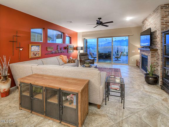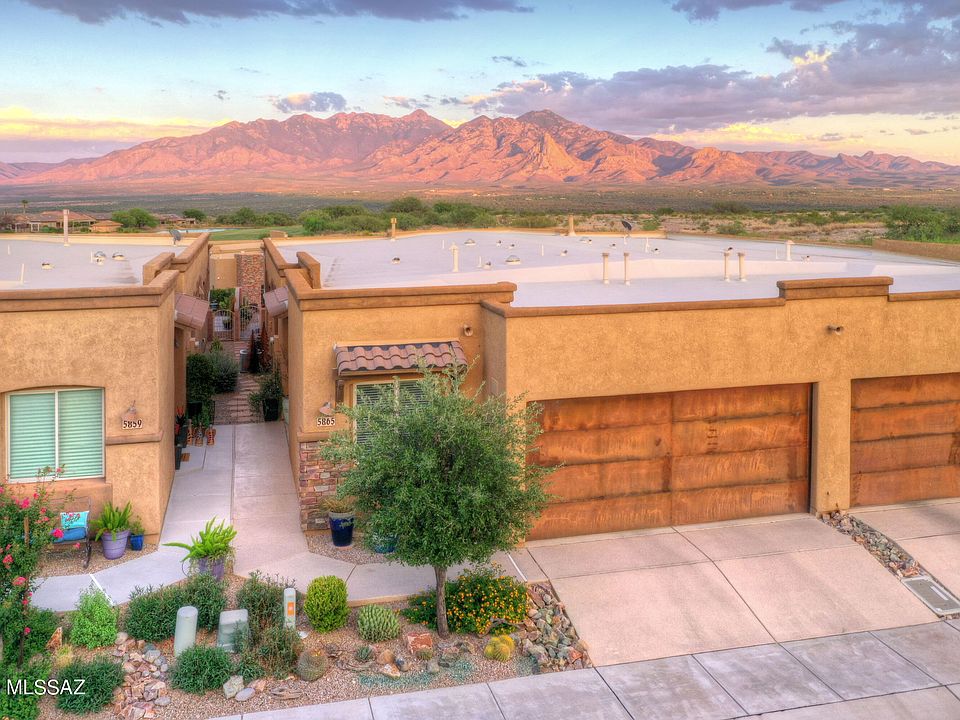 This gorgeous townhome shows off a timeless desert aesthetic with a modern edge and spectacular MOUNTAIN VIEWS! The copper look garage door creates impressive curb appeal and the Santa Ritas towering behind the house will take your breath away! Inside, the colors, textures and decorative surfaces in the great room and kitchen all compliment each other and huge glass sliders leading out to the patio frame those amazing views. Soaring ceilings add light and space and a brick fireplace creates a warm and inviting feel. If you love inside-outside living, leave the sliders open when entertaining on warm desert nights, so guests can gaze at the views while mingling with friends. The kitchen is an open, comfortable space and the breakfast bar is ideal for extra seating. A formal den is located at the front of the house and can be closed off to hide those messy projects. A calming aura emanates from your primary suite and glass sliders bring the mountain views straight inside. Your luxury bath features a massive tiled walk-in shower and TWO walk-in closets! Your guests can enjoy privacy and comfort in the guest suite tucked away on the opposite side of the home. An easy living lifestyle and surreal mountain views combine to make this house feel like an escape from every day life!