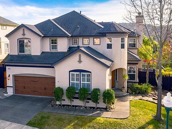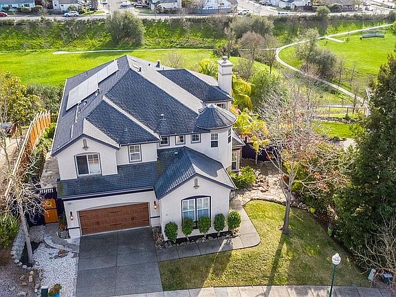 Distinctive home, quality craftsmanship in the French Normandy architectural style. Unencumbered elevation views of Annadel State Park's rolling hills from many interior vantage points, balcony, and decks. Zero net energy Solar powered home by Tesla. Energy conservation upgrades including double insulated garage door and low-E dual pane windows. There are a total of three oversized luxurious high ceiling en-suite masters within the floorpan of the home, fourth bedroom is used as an office, optional loft in place of 5th bedroom. Original owner since 2001. Originally designed by Architect Farrell-Faber & Associates, Inc. and built by Christopherson Homes as the original Eagle Ridge Development at Skyhawk. Several upgrades throughout the home including custom wrought iron staircase railing, honeycomb stained wood wainscot staircase paneling, crown molding, and exterior Brazilian cherry wood deck flooring installed. 7-inch wide plank London Beechwood installed flooring in main entertaining area, kitchen, and bar captain section. 5-inch wide plank cafe mocha stained solid Birchwood flooring installed in main master bedroom. Garage driveway lined with reclaimed European Belgian alley-way cobblestone. Oversized spacious 3-car garage. Dual zoned HVAC, jacuzzi, newer redwood side fencing installed on side elevation. The home is situated on an elevated gently sloped parcel with the right southern sun exposure facing a tree lined protected green belt among palm trees, evergreens, rolling oaks and olive trees for just the right level of privacy. There are no HOA fees required to live in highly desirable Skyhawk. There are less invasive Mello-Roos community district fees assessed for maintaining overall integrity of the Skyhawk subdivision's integration to the Depatment of Wildlife natural landscape, the natural Creek (wintertime river), lower marshland area and natural storm drain system.