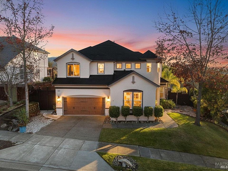 Perched on a premier street with sweeping outlooks, 5866 Sailing Hawk Ave is a rare blend of grand scale and curated, tactile luxury. Built by Christopherson, this home reflects quality construction and premium finishes throughout. Spanning over 3,700 square feet, the residence has been thoughtfully refined to deliver an elevated lifestyle that is both functional and striking. The experience begins upon entry, where a dramatic wrought-iron staircase anchors the foyer and sets a tone of quiet sophistication. At the heart of the home is a completely updated chef's kitchen, designed for connection and everyday enjoyment, featuring custom cabinetry, striking stone surfaces, and distinctive solid, uncoated brass hardware. This living finish brings warmth, substance, and timeless character to a space meant to be lived in and loved. The main level flows seamlessly from formal living and dining rooms into a relaxed family space, centered around one of two inviting fireplaces. Expansive windows draw the eye outward to scenic vistas across the surrounding hills and parklands. Just beyond, the generous southwestern-facing rear deck is ideal for sunset entertaining and includes architectural plans for accordion doors, offering the opportunity to further enhance indoor-outdoor living. Upstairs, versatility continues with a spacious landing, reading nook, and open loft perfect for a home office, media lounge, or library. The accommodations are both rare and thoughtfully arranged: an expansive primary suite with walk-in closet and spa-inspired bath, along with two additional junior suites, each with its own attached bathroom. ideal for guests or multi-generational living. Recent refinements include a fresh designer paint palette and upgraded flooring throughout. A Tesla solar system supports exceptional energy efficiency and long-term sustainability. Located within a top-rated school district and moments from premier shopping, dining, and Trione-Annadel State Park, this is more than a home it is a legacy property ready for its next chapter.
