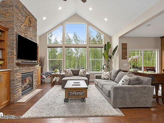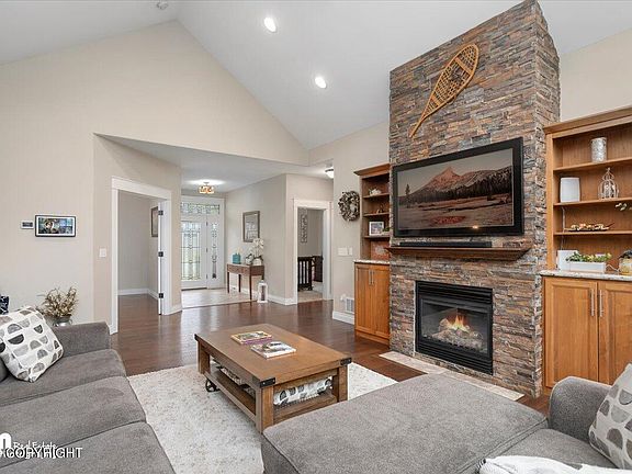Gorgeous Craftsman ranch-style home with full walkout basement. Wasilla Creek lines the backyard with silver salmon runs that can be viewed from two large south facing back decks. This home has it all! 4 Bedrooms, 3 Bathrooms, Theater Room, Office Room, 2 Living Spaces with Gas Fireplaces, Amazing kitchen with custom hickory cabinets, crown molding throughout, upgraded lighting and granitecountertops. Some additional features include: RV Parking 3 Car Garage Main Level Primary Suite with Primary Bathroom with soaker tub, walk in shower, double vanity and Large walk in closet. Private Primary Suite Deck 9' Vaulted Ceilings 2 Gas Fireplaces Stainless Steel Appliances Solid Wood Flooring Second Large Deck off of Dining Room Main Level Laundry/Utility Room with Sink Garage man door access to backyard Theatre Room Bonus Office Room Wet Bar in Basement Large Storage Room Staircase lighting Water Softener HRV System Hot Water on Demand System Large Fenced Yard Seamless Gutters Large Driveway Half Acre Lot Gorgeous Wasilla Creek in Backyard
