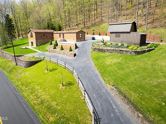 Unique Countryside Home/Retreat with breathtaking views of the mountains nestled on 13.25 mostly wooded acreage. The stone and vinyl exterior opens from the 16ft patio into a spacious gathering room, exposed beams, a brick wood burning fire place and ceramic tile flooring. The second level Great room is complete with Atrium windows, pellet stove, LP flooring, recess lighting. The kitchen cabinetry is oak, the refrigerator is recessed which adds more space to the kitchen. The trailer is dry wall throughout. Step out on to a 70 ft private rear patio, as you can enjoy the mountain views. The 2 storage sheds 10x20 and 10x12 provide ample space for outdoor equipment and hobbies accompanied with electric! Explore the outdoors with several ATV trails cut for easy access throughout the property! Local amenities near, Shawnee State Park, Blue Knob Ski Resort, Rocky Gap State Park