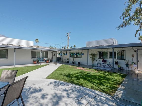 This mid-century modern unit in the Demuth Park area of South Palm Springs exudes tranquility, comfort and privacy. This complex in this upscale area which is fully surrounded by a 6 foot wall with security gates. The unit has its own private small backyard with gates leading to common areas or exits to the street for private entrances. The grounds have been tastefully landscaped in low to no maintenance pea gravel and native plants and trees all on drip systems and well-designed lighting. This ideal location is close to all amenities including Palm Springs Airport and Museum, shopping centers and just minutes from great dining and shopping in downtown Palm Springs.