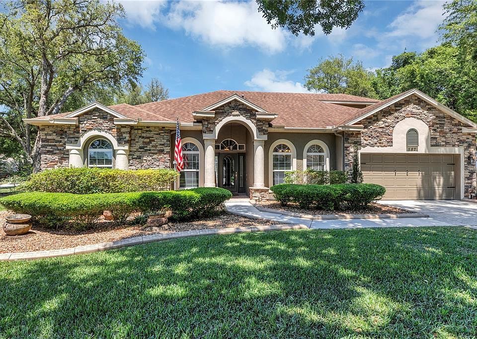 Welcome home to 587 Lanarkshire Place in the highly sought-after Rock Springs Ridge! Nestled on an expansive .61-ACRE CORNER LOT, this stunning residence offers a picturesque setting with towering oak trees creating a serene park-like ambiance. Step inside to discover a grand entrance with high ceilings adorned with custom stone and trim work. Featuring 4 bedrooms, an office, and a spacious bonus room, this home offers versatile living spaces that could easily accommodate additional bedrooms or personalized use. There are also 3 full baths, including a master bath showcasing CUSTOM CABINETRY and GRANITE COUNTERTOPS. The roomy kitchen is outfitted with GRANITE COUNTERTOPS, STAINLESS STEEL APPLIANCES, a large stainless steel sink, exquisite stone backsplash, and convenient touches like a TOUCH ON/OFF KITCHEN FAUCET and cabinet slideouts for effortless organization. Plus, enjoy the added convenience of a WATER SOFTENER. Entertain outdoors in style with an oversized enclosed backyard, PAVER PATIO, and SOLAR-HEATED POOL, creating the perfect backdrop for cherished moments with family and friends. Meticulously maintained, this home has numerous recent upgrades including a NEW ROOF in 2016, AC REPLACEMENT in 2022, EXTERIOR PAINT in 2022, STONE EXTERIOR ACCENTS added in 2021, and a NEW WATER HEATER in 2024. Location is key, and this residence is ideally situated within the coveted Kelly Park School district, just minutes from the Fields of Fame sports center, the new Kelly Park Publix, and easy access to the 429 and new Wekiva Expressway. Don't miss out on the opportunity to call this beautiful house your home. Schedule your viewing today!