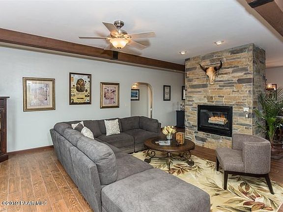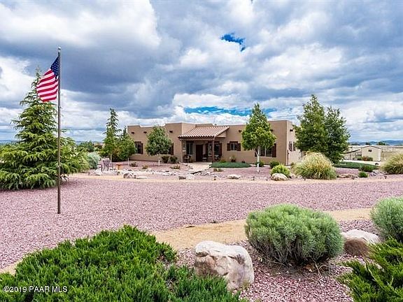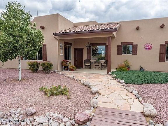 Sophisticated Santa Fe with bright airy open floorplan. Enjoy your private drive and solar gate that welcomes you to your fully fenced 2.5 acre piece of heaven! Wake to coffee and sunrise views of San Francisco Peaks and Mingus Mountain range off secluded back patio and relax with sunset views over Granite Mountain and Chino Valley rolling hills from front porch. Sheltered back patio lets you enjoy the outside all year round. Once inside the views are still there. Everyroom enjoys a gorgeous long distance view. Open floorplan lets company traffic flow easily so entertaining is a breeze. Spacious living room and dining room are divided by rare Oklahoma Sandstone finished fireplace. Beautiful beams with strapping accents grace the living areas and master bedroom. The family room has views to