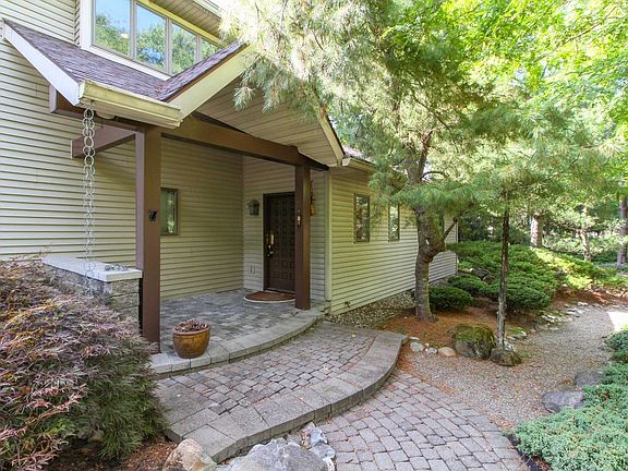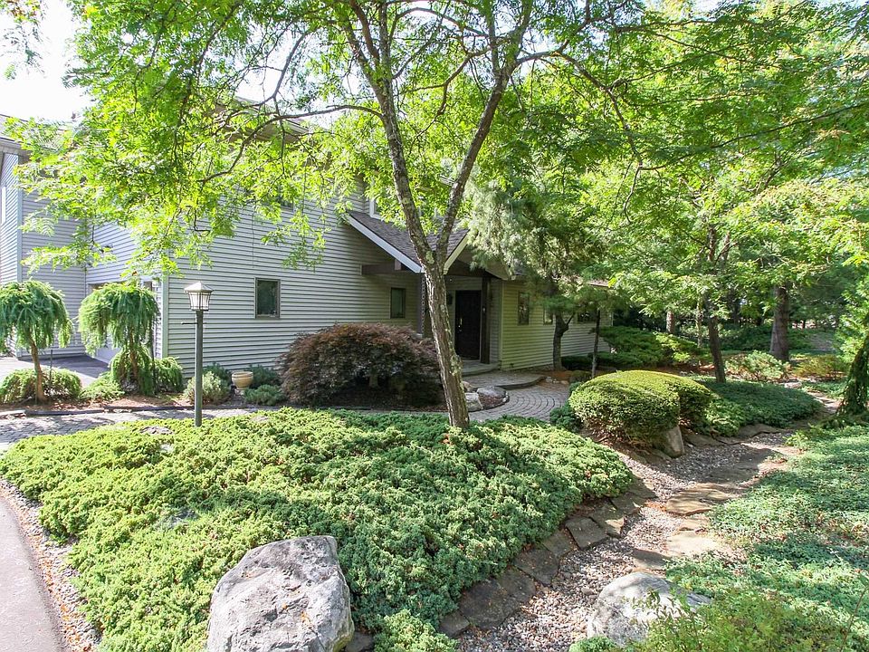 This immaculate contemporary design offers a clean, minimalist aesthetic, an emphasis on bringing the outdoors in and a unique embrace of the stunning and diverse landscape. An abundance of glass showcases a fascinating marriage of specimen trees, ornamentals and ground plantings, engaging and stimulating the senses. A mid-century modern influence can be felt throughout this beautiful home, with high ceilings, custom built-ins, integrated closet systems, solid wood doors and hardwood and ceramic flooring in the main living volumes. Double French doors off of the foyer lead to an expansive living room with walls of windows, custom shelving, a wood stove and access to a private, rear patio. Nearby is a dining room that overlooks gardens and a grand oak tree. The stunning kitchen with exacting craftsmanship is a chef's delight, accented by stainless appliances by Sub-Zero, Thermador and Gaggenau. The main level also includes a bedroom, full bath and laundry room. The second level has the primary bedroom, two secondary bedrooms as well as a luxurious bath. The basement offers great storage, and the two-car attached garage has a separate workshop/garden tool room. Heating and cooling is geothermal, and there is an external backup generator. Come visit this exceptional home and its wonderland garden landscape.
