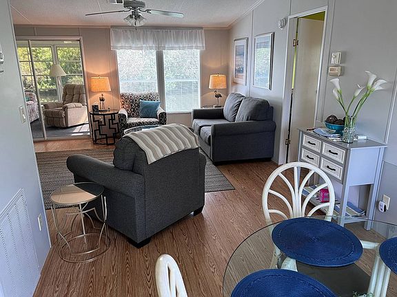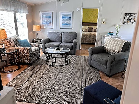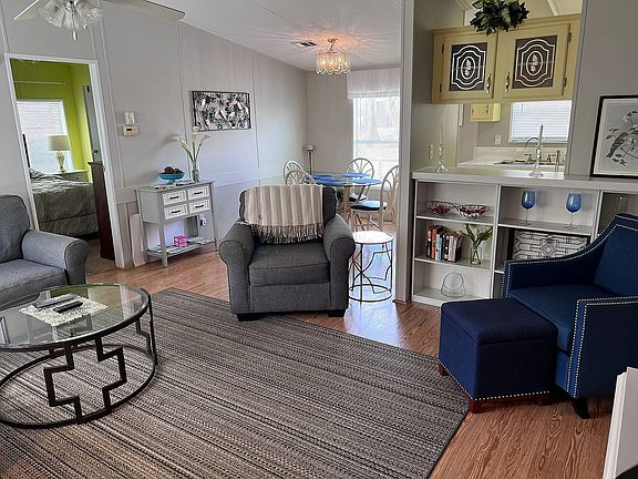 WATERFRONT living in Florida. Completely remodeled 2/2 split. Laminate and vinyl flooring in traffic areas w/newer carpeting in BRs. Kitchen cabinets all painted, w/additional kitchen storage. Beautifully furnished. Baths updated. The lanai features nice sitting area w/couch and chair. Lg window AC to keep you cool watching TV or sipping cocktails while enjoying your great view of a tranquil pond out back. 2 car carport. Extended shed has laundry area and parking for your included gold cart.