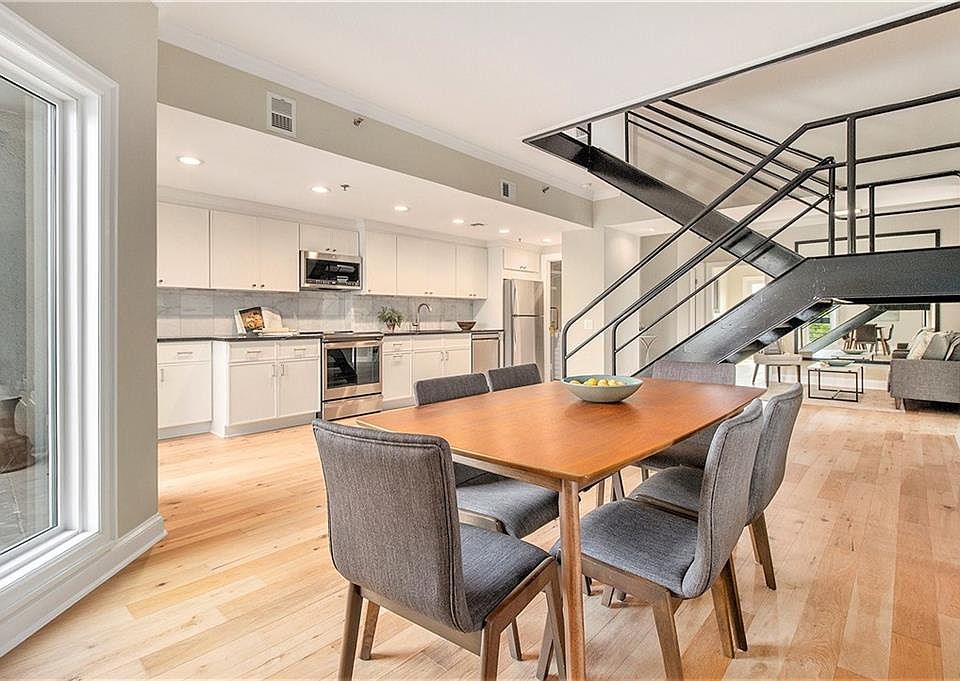 Entering this fully-renovated 2-story condo is like finding a new construction, 3-bedroom, 2 bathroom home with 2-car garage in the city. It’s an unbelievable find even before adding the fact that it’s only steps away from the Beltline, Piedmont Park, and Trader Joes, or even that it is the only residential midrise in the area. Looking out of your windows or from the rooftop patio you only have skyline and park views and not the view of a neighboring high-rise. Stepping in through the condo’s front door you are in a bright foyer with open-railed stairs to your left. A light-filled ensuite on this level can be a private owner’s suite or a perfect separate space for guests. It has skyline views, built-in shelving, a very deep walk-in closet and a velvet-tufted headboard. The private bath has European flair fully tiled shower and surround and modern vanity. Do not miss the medicine cabinet. The lower-main floor opens below you as you descend the steel staircase, each riser and the landing are covered in quiet, high quality material. An expansive engineered wood floors guides you through a bright, completely brand-new interior. he living area is adorned with large mirrors that bounce natural light throughout the space, creating a sense of openness and flow. The kitchen is a sleek showpiece featuring new white cabinetry, marble backsplash, dark stone countertops, and brand new appliances. The adjoining balcony makes indoor-outdoor entertaining a breeze. A dedicated dining space just off the kitchen offers stunning Midtown views, perfect for hosting. The den, nestled nearby, provides an intimate space ideal for relaxing. The main-floor primary suite boasts a Juliette balcony with Beltline views, direct access to a full bath with a tub/shower combo, and generous closet space. The main-floor secondary bedroom features Beltline views, custom shelving, and an oversized closet—perfect for guests or roommates. This unit has a coveted 2 assigned parking spaces in the secure entry, gated garage parking below. The rooftop terrace with panoramic Midtown, Downtown and O4W views has events for the residents or just your own coffee hour. Just blocks from Ponce City Market, the Beltline, Piedmont Park, and Atlanta’s best dining, shopping, and cultural events—you’ll love calling this stylish sanctuary home. But be warned: living here may spoil you for anything else. Live where Midtown and the Beltline meet with this exceptional three-bedroom, two-bath loft—the only residential midrise in the area with unbeatable proximity to some of Atlanta’s most desired destinations.