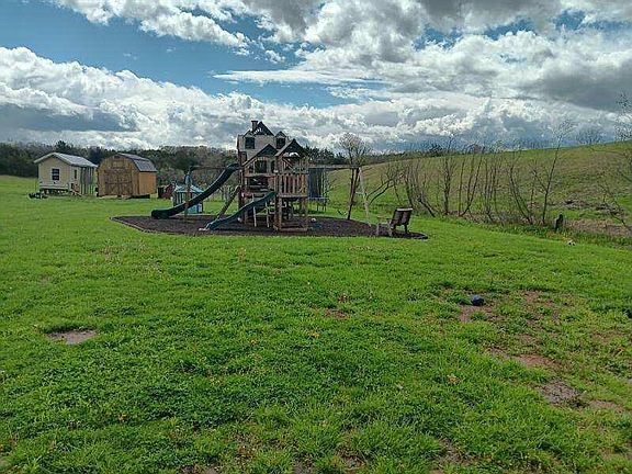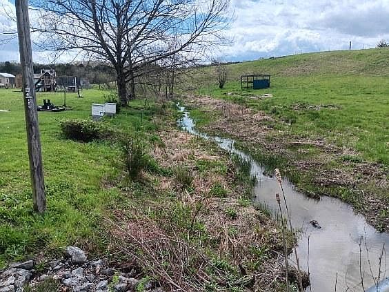 Step inside to discover hardwood flooring throughout, complemented by maintenance-free vinyl siding, ensuring both durability and elegance. The tranquil ambiance of a small stream meandering through the backyard adds a touch of nature to your everyday life, while the meticulously maintained creek bed guarantees worry-free living. The kitchen and baths boast beautiful ceramic tile, blending beauty with functionality seamlessly. With a partially finished basement bonus room, you'll have ample space for guests, crafts, or storage, making this home as practical as it is picturesque. Enjoy the convenience of a 2-car garage in the basement, along with a small chicken coop and fenced-in run area that can easily be transformed into a garden space. Raised garden beds await your green thumb, while peach, pecan, and persimmon trees, along with a blueberry bush, offer fresh fruits right at your doorstep. Additional features include a new storage building with electricity, a huge wooden playground, and a trampoline for endless outdoor fun. Two driveways, one with a 30/50 amp power hook-up for a camper and access to water, provide versatility for your lifestyle needs. Stay comfortable year-round with a brand-new HVAC system installed in December 2023 and a hot water heater installed in 2022. A wood-burning stove and an in-ground propane tank, ready for easy hook-up to a fireplace or gas range, offer added warmth and convenience. Relax and unwind on the concrete patio with a hot tub, or enjoy the serene views from the back porch and covered front porch. Conveniently located near employment opportunities, shopping centers, and restaurants, everything you need is right at your fingertips. Don't miss your chance to make this exquisite property your forever home. Schedule a showing today and experience the perfect blend of tranquility, convenience, and charm.