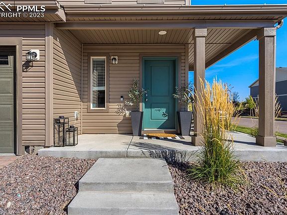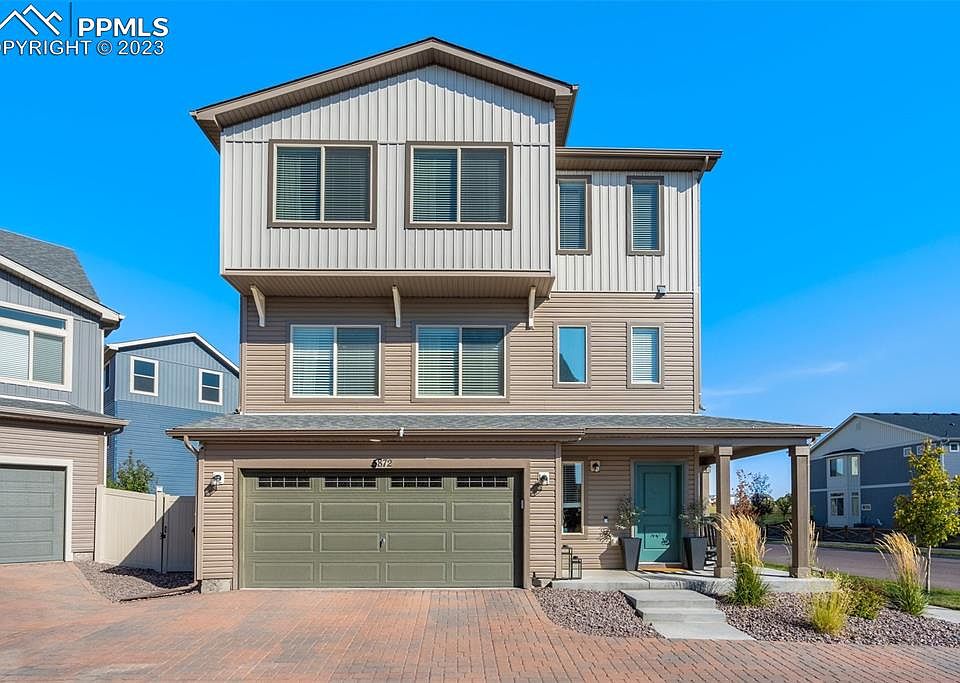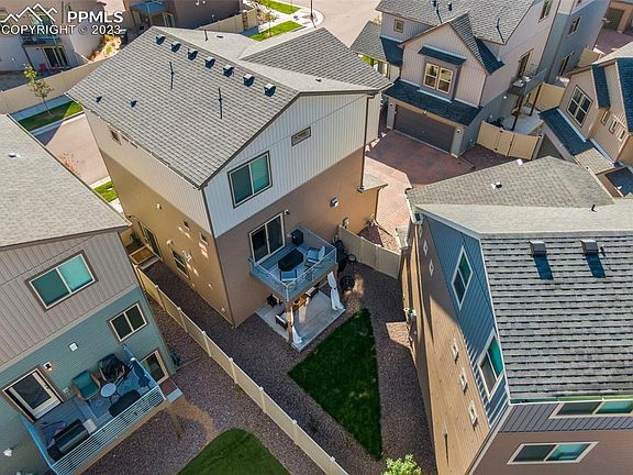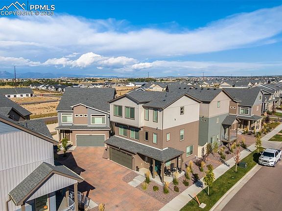 Experience effortless living in this contemporary Banning Lewis Ranch home, boasting low-maintenance features and designer upgrades throughout. This home has been meticulously maintained, and no upgrade was spared. Walking in from the expansive front porch, you'll find a generously sized flex room with access to the backyard. The upper level reveals an inviting open-concept living area, dining room, and kitchen. The bright and airy living room is a haven for relaxation, complete with a fireplace, tray ceiling, and large windows. Right off the dining room, you'll find a deck which offers a great setting for grilling. The spacious chef's kitchen features an extra-large island, abundant cabinetry, and a large pantry, all upgraded with hand-picked quartz, designer cabinets, and a backsplash. The large pantry and flex room/office nook off of the kitchen are ideal for planning out your day, storing your pet supplies, or simply as extra storage. Canned lighting throughout the home illuminates the space, creating a welcoming atmosphere. You'll also find prewiring for a sound system in the family room, enhancing your entertainment options. On the third level, a roomy laundry room, well-sized bedrooms, and the owner's suite with an attached bathroom and spacious walk-in closet await. Additional highlights of this property include air conditioning, a central vacuum system, a corner lot location, and convenient access to a park and green area less than a minute away. In the backyard, a concrete slab has been added, expanding the outdoor living area. This community offers an array of exceptional amenities, including the Banning Lewis Ranch Academy (K-8), a 24-hour fitness room at the Community Center, and an outdoor Jr. Olympic heated pool. Residents can also enjoy a splash park, tennis courts, and over 65 acres of hiking trails and parks. This modern BLR home provides effortless living and access to top-notch community amenities, making it the perfect place to call home.