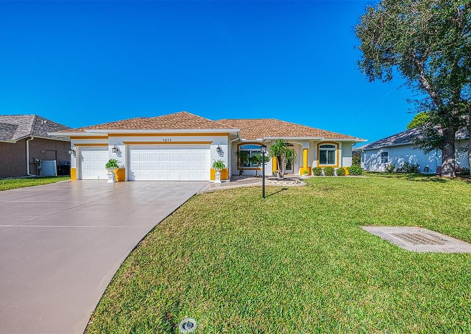 **BIG $30K Drop! Price Correction to meet market** Offers welcome! Well-maintained GEM in Gulf View Estates! NO CDD! LOW HOA. 3 Bed, 2 Bath block home with RARE, hard-to-find 3-CAR GARAGE! Bring your toys and stuff! Split floor plan in Gulf View Estates. BONUS---NEW ROOF 2025 and Hurricane Shutters included. (HVAC 2020, 3 Ton, 16 SEER) LIGHT and BRIGHT home with freshly painted exterior and interior. Personal well for Irrigation. Entertain in the great room open to Dining and Modern kitchen. Vaulted ceilings add to the natural abundant light. Great Room has views out the triple sliders to serene covered, screened lanai surrounded by tropical garden. Sip your morning coffee in a beautiful space! Move-in ready! CLEAN! This classic split Florida floor plan allows for flexibility. The 2nd bedroom has a closet and the 3rd bedroom can also be used as a Den instead of a bedroom. Master Bedroom has access to the lanai. Dual sinks in Master Bathroom with a tile walk-in shower. This home is tucked in the quiet part of Gulf View Estates, an enclave community with LOW HOA - $325 per year. NO CDD FEES here!! Minutes to Manasota Key and all of Venice medical, restaurants, dining and shopping. 3-CAR Garage to hold all your toys! Hot Water Heater (2020) Garage includes sink and side door, extra storage cabinets. Beautiful well kept lawn with well irrigation for water. LOW-maintenance landscaping with rocks all around. Landscape water is well. No metered water here! New GUTTERS. **2025 WIND MITIGATION & 4-POINT INSPECTION INCLUDED** <--Saves Buyer Money. Don't miss your chance at a low-maintenance, LOW HOA community in beautiful Venice, FL. Truly a GEM in Gulf View Estates! ---NO SEPTIC SYSTEM - Home is connected to County Water.