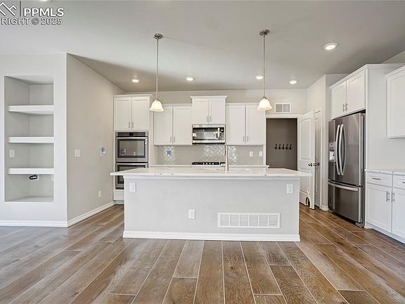 Set in Rockrimmon’s Wildgrass community, this end-unit townhouse offers a rare combination of space, design & convenience, all within Academy District 20 schools. The location provides quick access to I-25, UCCS, & the Air Force Academy, making it ideal for commuters or military. Outdoor enthusiasts will appreciate nearby Pulpit Rock, Ute Valley Park, & Rockrimmon’s trail network, while shopping, restaurants, & neighborhood parks are just minutes away. Inside, the layout flows seamlessly w/ a main-level primary suite positioned just off the living room. Vaulted ceilings & natural light define the open-concept kitchen, dining, & living spaces, designed for both daily life & entertaining. The kitchen stands out w/ quartz counters, expansive prep space, stainless appliances, gas cooktop, double oven, & 42” upper cabinets finished w/ crown molding. Upstairs, two additional bedrooms share a full bath, while the fully finished basement opens into a massive family room offering flexibility for theater, fitness, or game space. A fourth bedroom & full bath complete the lower level. Every bathroom is detailed w/ upgraded finishes, highlighted by the primary suite’s floor-to-ceiling tiled shower & dual vanities. The home also includes a composite deck for outdoor dining, a two-car attached garage, & low-maintenance living supported by HOA services covering snow & trash removal. With over 3,100 finished sq ft, thoughtful upgrades, & mountain views, this property combines modern comfort w/ the lock-and-leave lifestyle.