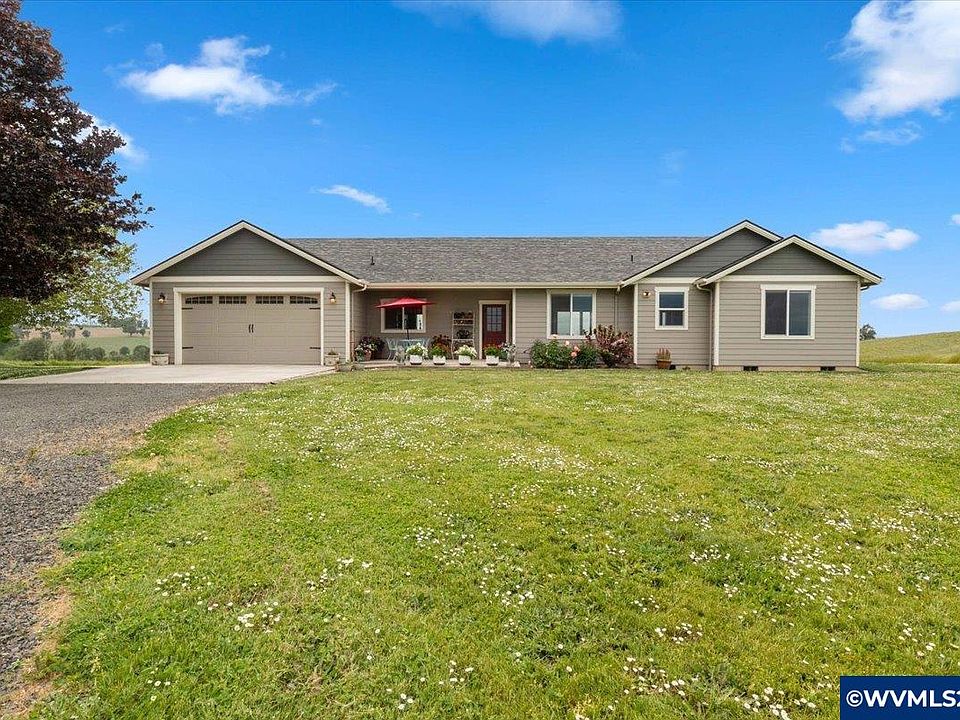 Perched on a hill with sweeping views from both the front and back, this beautiful 3 bedroom, 2.5 bath home offers style and comfort. The open-concept floor plan is perfect for entertaining, featuring a chef’s kitchen with knotty hickory cabinetry, quartz countertops, and built-in ovens. Spacious living areas flow seamlessly, creating a warm and inviting atmosphere to call home. Large multi purpose building with lean-to for equipment storage. In Perrydale school district.