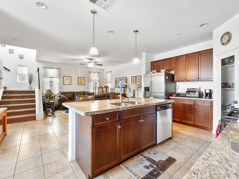 Asking Price $449,999 to $474,900. Gorgeous double story home available in wonderful Lodge Community in Eastvale! This home is a turn key property! The curb appeal is stunning with its brick detailing, landscaping and alcove entryway. Upon entering the home, you are directed right into the wide open layout that is accented by beautiful stone tile floors, bright recessed lighting and ceiling fans throughout. With gracious living area, this home is perfect for the entertainer or someone looking for an easy access layout. As you move through the home, you will see the completely open kitchen, offering stainless steel appliances, granite countertops, beautiful wood cabinetry and large walk in pantry. The bar top island and attached dining space offers plenty of room for additional seating, as well as access to the spacious patio via sliding glass doors. The bedrooms all feature plush carpeting and huge windows, but the master is truly a homeowners retreat! Spacious and inviting, the ensuite is a treat with its double vanity and spa style soaking tub! HOA Amenities include Fitness Center, Club House and Pool.