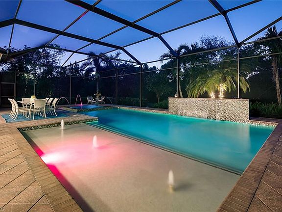Chic and sophisticated, this sprawling home offers fabulous living space inside and out. Situated on a very private oversized lot, the home is a complete WOW! Gleaming wood grain porcelain floors are the backdrop for fabulous finish details and luxury extras, including a fabulous recently renovated white marble kitchen loaded with special features, massive great room with stylish built-ins, spa-like master suite complete with built-ins, massive, attached lounge, and state-of-the-art luxury bath loaded with amenities. This newer home built 2015 offers impact windows and doors and unparalleled outdoor space. The covered AND uncovered lounging and dining area are massive, as are the oversized lap pool and 10-person spa. Fabulous outdoor kitchen with dramatic backsplash, stainless appliances and hood, cypress ceiling, fireplace and mounted TV come together to create a resort-like atmosphere all in a completely private setting on a huge lot. Loads of reasonable membership opportunities are available in this first-class, amenity-rich and recently renovated club. Superb location offers easy access to Olde Naples, Mercato, A-rated public & private schools, the beach and more!