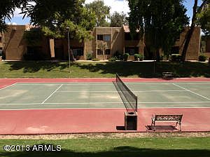 Nicely remodeled in 2006. This ground level corner unit features 2 bedrooms, 2 baths, & a spacious Great Room with dining area. One of the favorite models. Granite counters throughout. All stainless steel appliances. Earth tone colors, with carpet and travertine tiles. Great location within the complex, with easy access from the parking lot to the unit. This floor plan also includes a sliding glass door leading to the covered patio with a block fence. The complex features a heated community pool/spa, tennis court, fitness center & clubhouse. Conveniently located close to shopping, schools and Old Town Scottsdale. Welcome Home!