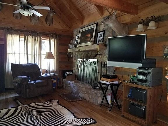 The land is 102 acres (''+/- estimated'' per deed). A true cabin made of large, interlocking hemlock logs & chink with big porches & a pine interior is perched above a creek that runs along the front with a 13ft fall. Large fields for gardens, food plots & a small pond are dispersed among large wooded areas. The property is surrounded by natural lands. Great hunting is proven--turkey, deer & other wildlife abound. The main living area has a wide, open floor plan combining kitchen, living, & dining, with 2 nice bedrooms & a full bath. A large loft with a ½ bath is above. Heating is by stone hearth fireplace, propane, or the heat pump that also cools in the summer. A big garage is on a large flat area below the cabin. There is no survey. The property is sold by boundary, not by the acre. Electricity, well, septic, central cooling/heat, a fireplace, an extra propane heat source, and the alarm system are all in. All of the usual kitchen appliances stay. The driveway is shared with one adjacent neighbor. The property has been used as the Seller's own personal man-cave and his giant hunting resort. So, you may find the outside needs to be spruced up. The yard area could be more developed by clearing brush and putting grasses and landscaping in. Opening up creek, especially where it falls off, will render it most enjoyable. Otherwise, the fields and the natural woods are truly beautiful and the view of the surrounding mountains is not only quite nice, but very private.