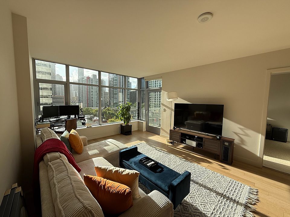 Modern 1-bedroom with stunning south-facing city and bay views. Features floor-to-ceiling windows, hardwood floors, and a high-end kitchen with gas cooking and stainless appliances. Enjoy 5-star amenities: 24-hr concierge, indoor pool, sauna, 2-story gym, rooftop deck, theater, pet spa, car wash, and lounges.